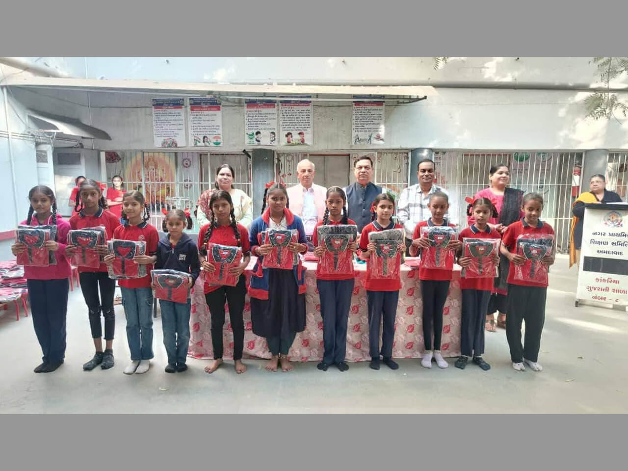 કાંકરિયા શાળા નં. ૮ ખાતે પ્રભાત ફાઉન્ડેશન દ્વારા બેગ અને યુનિફોર્મ વિતરણ